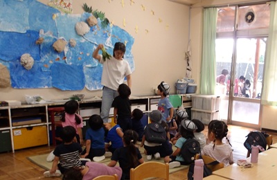 用意した野菜は、オクラ・レンコン・ピーマン・チンゲン菜。降園前の集会時にみんなの目の前で実際に野菜を包丁で切り、切り口を見てみました。するとみんな興味津々。オクラやレンコンは目にしたことのある人も多く、「ほし!」「穴があいてる!」など、予想通り!という反応で、みな嬉しそうに答えていました。ところが、チンゲン菜をみせて「どんな切り口かな?」と問いかけると「?」「葉っぱ?」みんなちょっと予想がつかない様子です