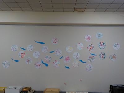 段ボールで魚をかたどったスタンプをし、壁面の自然広場にお魚を泳がせたことをきっかけとして、「かたち」に興味を持った子どもたち。段ボールで、丸や三角、星やお花の形などを作っておきましたら、好きな色を選んでスタンプを楽しんでいました。そんな折、自宅で調理中オクラを切った時にふと、「この野菜の切り口面白いかも。」と思い、子どもたちと一緒に野菜の切り口でスタンプをしてみることにしました。