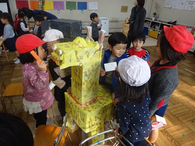 できあがった動物たちをお散歩に連れ出してくれたり、エサを作って与えてくれたりと飼育員さんごっこをして楽しむ様子がありました。そんな様子や、大きな動物がばら組にある事が気になる他学年の姿があり、お客さんを呼んだらもっと楽しめるのではないか…?!と考え、ご招待してみてはどうかと子どもたちに打診してみました。