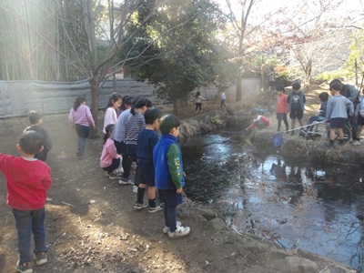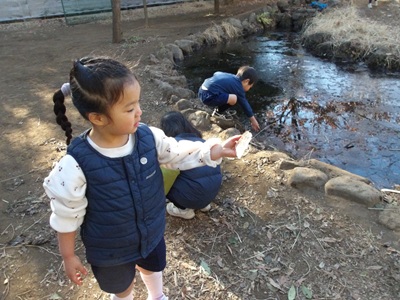 先日暖かかった日に自然広場に行ったときには、何人もの人が“池ポチャ”(飛び石を渡ろうとしてぽちゃんと落ちたり、水の中を歩いてしまったり)していたので「この間は池ポチャして着替えた人もいたけど、今日はどうかなぁ。」とつぶやくと「今日池ポチャは凍っちゃうよね!」「すごく冷たいよね」と寒さを予想している子どもたちでした。